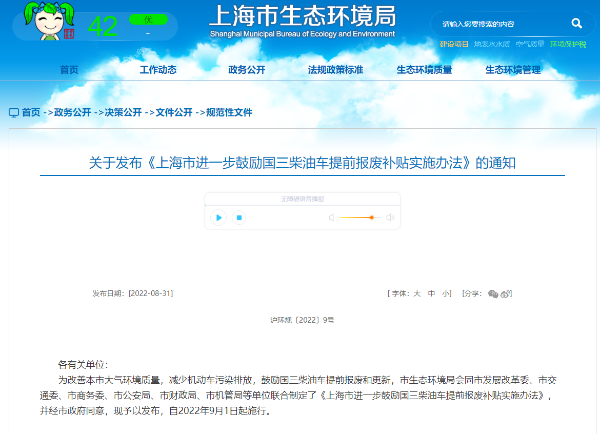 為改善本市大氣環(huán)境質(zhì)量,減少機(jī)動(dòng)車污染排放,鼓勵(lì)國(guó)三柴油車提前報(bào)廢和更新,市生態(tài)環(huán)境局會(huì)同市發(fā)展改革委、市交通委、市商務(wù)委、市公安局、市財(cái)政局、市機(jī)管局等單位聯(lián)合制定了《上海市進(jìn)一步鼓勵(lì)國(guó)三柴油車提前報(bào)廢補(bǔ)貼實(shí)施辦法》,并經(jīng)市政府同意,現(xiàn)予以發(fā)布,自2022年9月1日起施行。