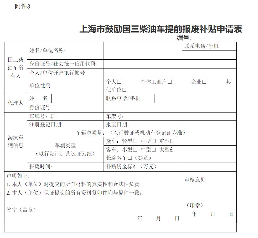 符合本辦法補(bǔ)貼范圍,需申請(qǐng)國(guó)三柴油車提前報(bào)廢補(bǔ)貼的,車主應(yīng)先將車輛交由本市機(jī)動(dòng)車拆解企業(yè)辦理報(bào)廢手續(xù),取得《報(bào)廢機(jī)動(dòng)車回收證明》和《上海市機(jī)動(dòng)車注銷證明》后,向指定受理點(diǎn)提交《上海市鼓勵(lì)國(guó)三柴油車提前報(bào)廢補(bǔ)貼申請(qǐng)表》(附件3)及其他申請(qǐng)材料。