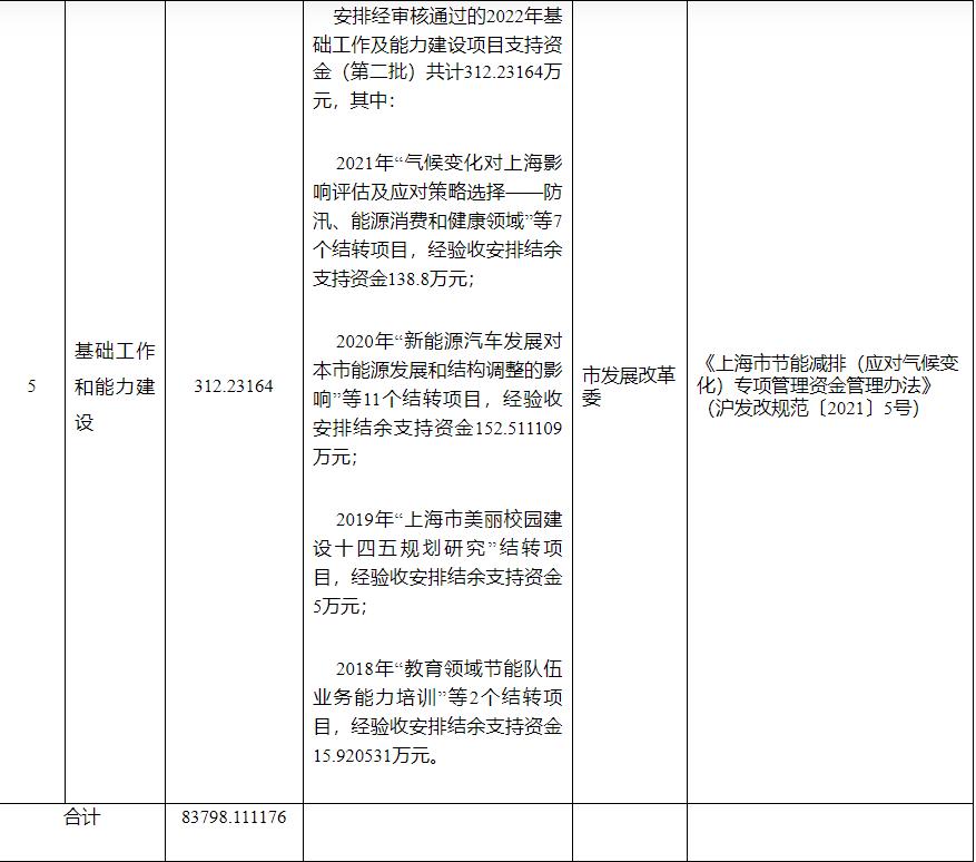5、按照《上海市節(jié)能減排(應(yīng)對氣候變化)專項資金管理辦法》(滬發(fā)改規(guī)范〔2021〕5號)等規(guī)定,安排經(jīng)審核通過的2022年基礎(chǔ)工作及能力建設(shè)項目支持資金(第二批)共計312.23164萬元,其中: