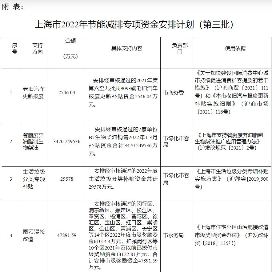 2、按照《上海市支持餐廚廢棄油脂制生物柴油推廣應(yīng)用管理辦法》(滬發(fā)改規(guī)范〔2021〕2號)規(guī)定,安排經(jīng)審核通過的2家單位2022年1-3月B5生物柴油銷售補貼資金合計3470.249536萬元。