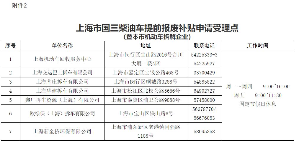 市生態(tài)環(huán)境局會(huì)同市商務(wù)委、市公安局、市財(cái)政局、市交通委指導(dǎo)第三方機(jī)構(gòu)在本市各機(jī)動(dòng)車拆解企業(yè)所在地設(shè)立“上海市國三柴油車提前報(bào)廢補(bǔ)貼申請(qǐng)受理點(diǎn)(暨本市機(jī)動(dòng)車拆解企業(yè))”(附件2)開展相關(guān)工作。
